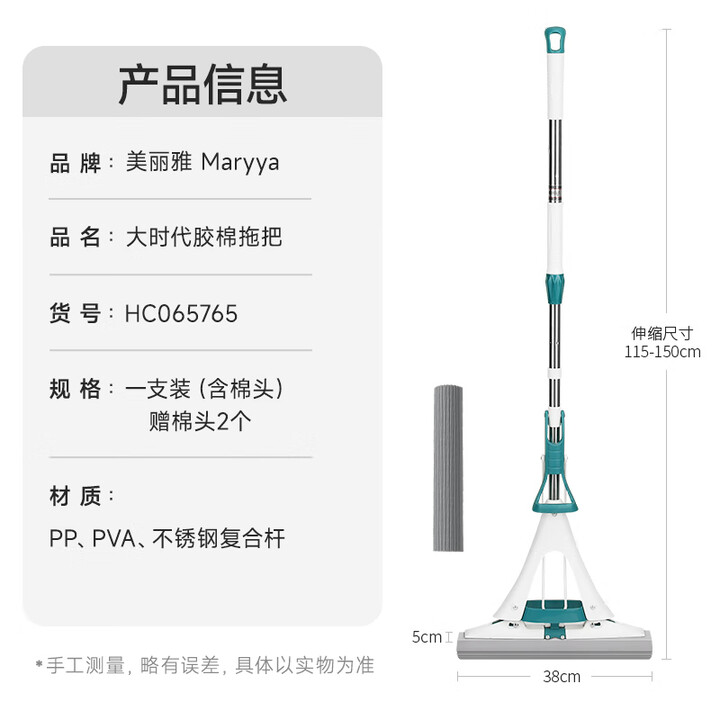 美丽雅 HC065765 头宽约38cm 伸缩杆长150cm 含胶棉头3个 对折挤水 大时代胶棉拖把套装
